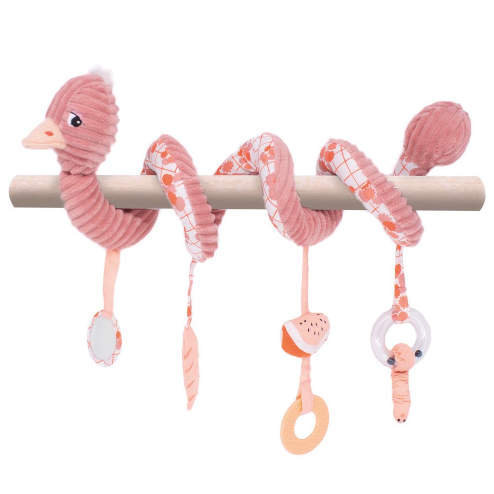 Stimuleer de zintuigen van jouw baby met deze leuke activiteiten spiraal. Deze leuke activiteitenspiraal struisvogel Pomelos nodigt kleine ontdekkers uit om te ontspannen, leren en ontdekken. De spiraal kan eenvoudig om een box, autostoel, kinderwagen of loopstoel worden bevestigd. deze activiteitenspiraal is voorzien van sensorische speeltjes met; ritselend papier, een pouet-pouet (piep speeltje), een kleine spiegel en een bijtring.