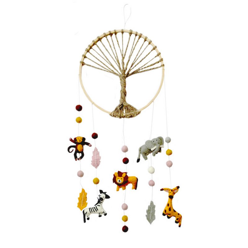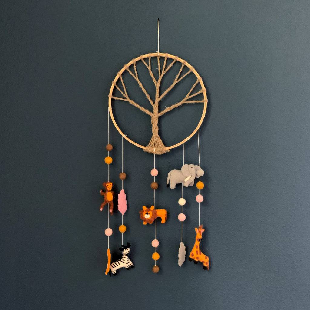 Wist jij dat de levensboom een symbolisatie is van groei en ontwikkeling, vruchtbaarheid, onsterfelijkheid en genezing. Deze dromenvanger van BeYoona is dan ook een uniek item voor in de baby of kinderkamer! Deze dromenvanger in safari thema is erg leuk ter decoratie aan de muur in de kinderkamer maar ook op te hangen als mobiel. De safari dromenvanger heeft een diameter van 30cm. De vilten beestjes zijn gemaakt van 100% zuivere wol.