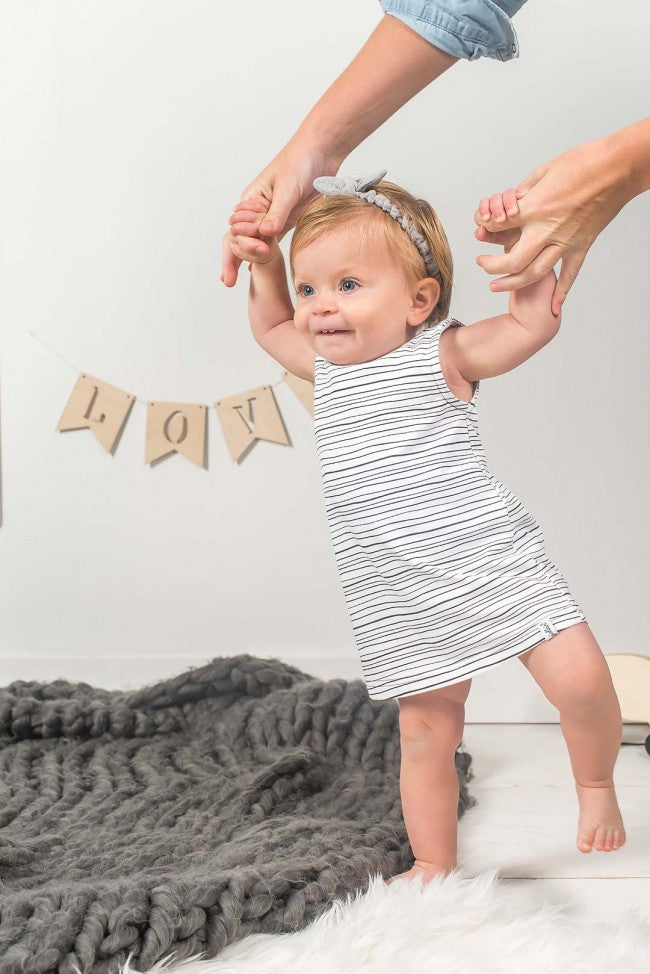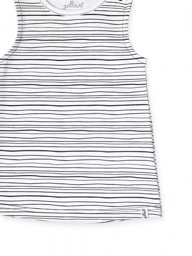 Leuk a-lijn jurkje voor baby’s met zwarte streepjes van Jollein. Het jurkje is een fijne basic in wit met leuke zwarte streepjes. Het jurkje voor baby’s is gemaakt van biologisch katoen en elastaan. Het mooie jurkje is verkrijgbaar in de maten 50/56, 62/68 en 74/80. De kleding van Jollein is GOTS gecertificeerd.