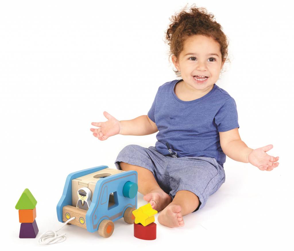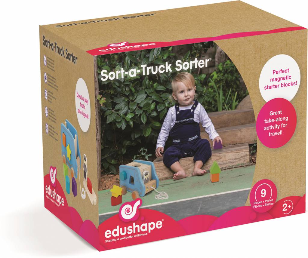 Vormenstoof truck van Edushape. Een gave houten vormenstoof in de vorm van een vrachtwagen. Hij biedt dubbel speelplezier, rijdt ermee in het rond of zoek de juiste vormen bij de openingen. Het spelen met deze vrachtwagen is zowel leuk als leerzaam, want het stimuleert de motoriek en helpt met de herkenning van vormen en kleuren.